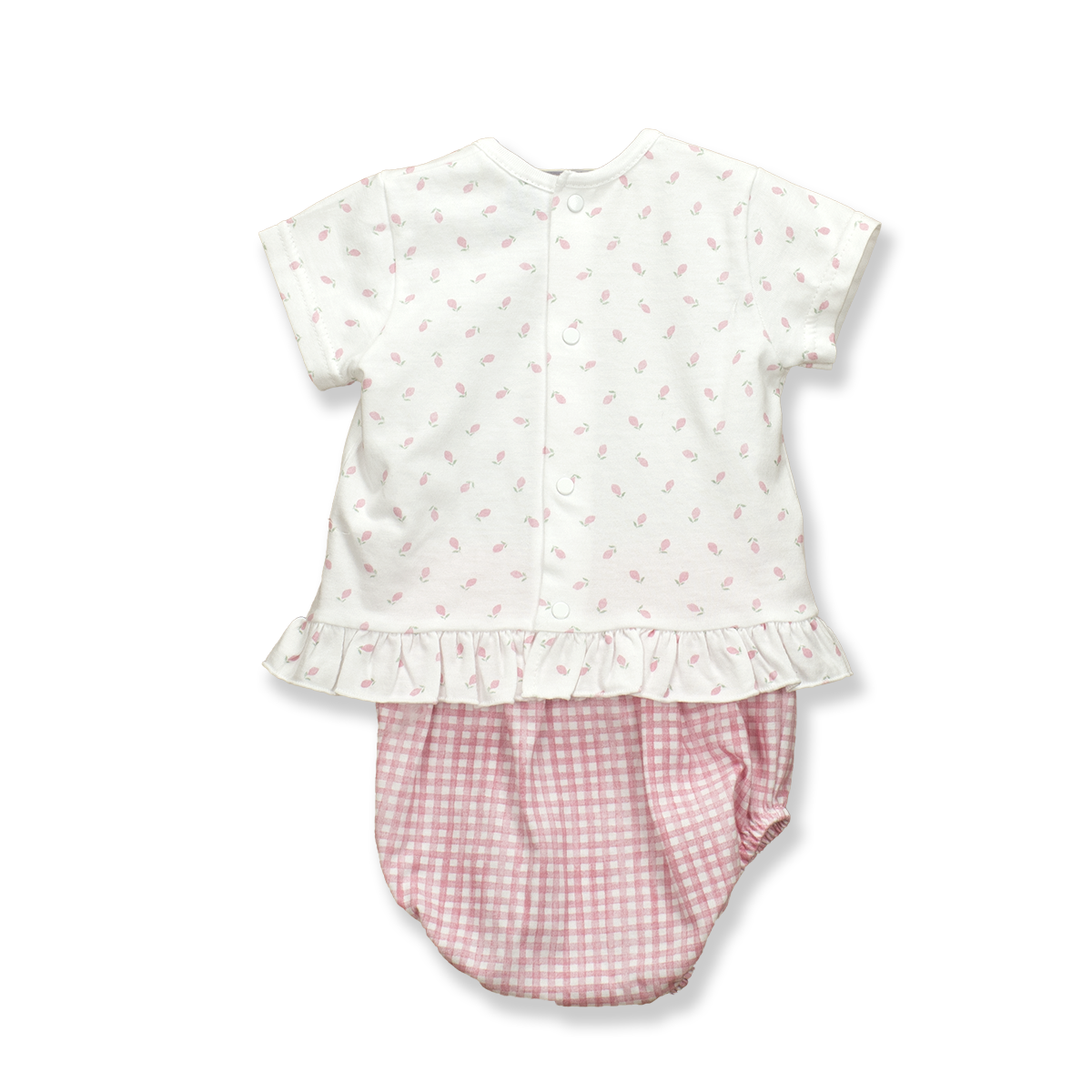Precioso y fresquito conjunto de algodón de Babidu. Está confeccionado en tejido 100% Algodón en tonos rosa y compuesto por una camiseta de manga corta con tapeta y braguita a juego.