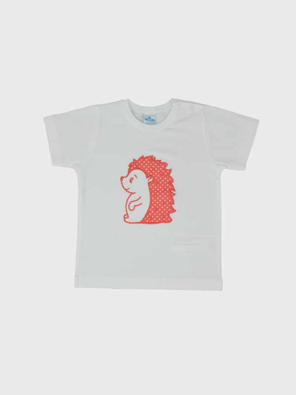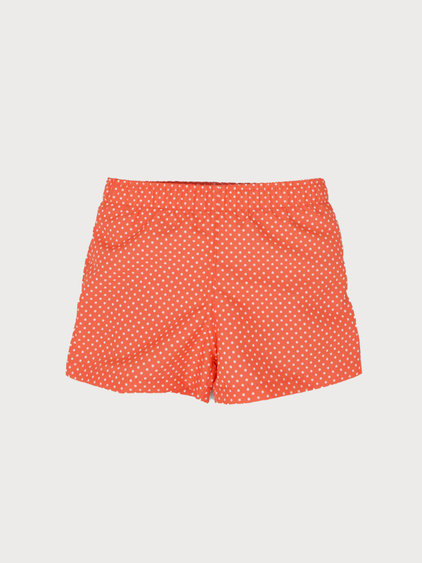 Conjunto de baño para bebé formado por camiseta y bóxer a juego. Bóxer naranja con estampado de topitos blancos, la camiseta lleva un gracioso erizo bordado con la tela a juego del bañador.