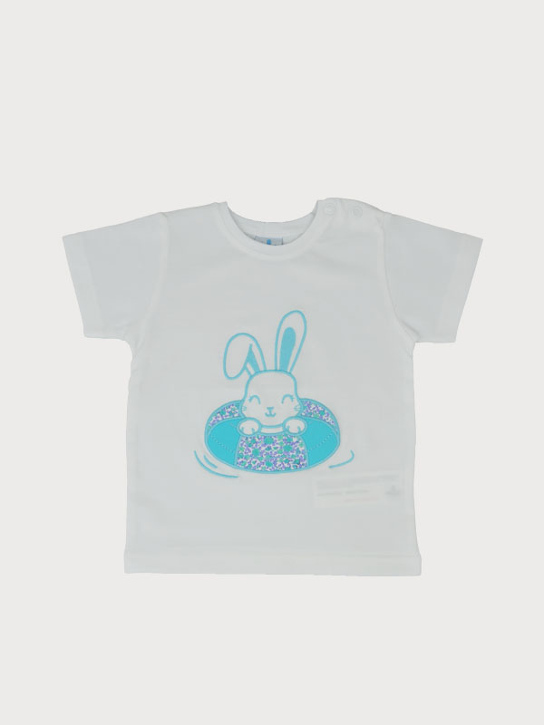 Conjunto de baño para bebé formado por camiseta y bóxer a juego. Bóxer con estampado de florecitas en tonos azules, la camiseta lleva un gracioso conejito bordado con la tela a juego del bañador.