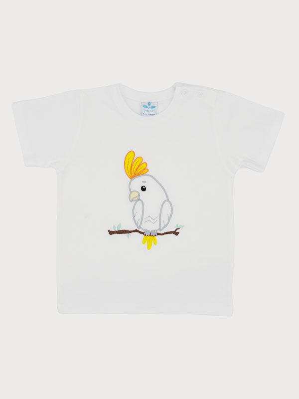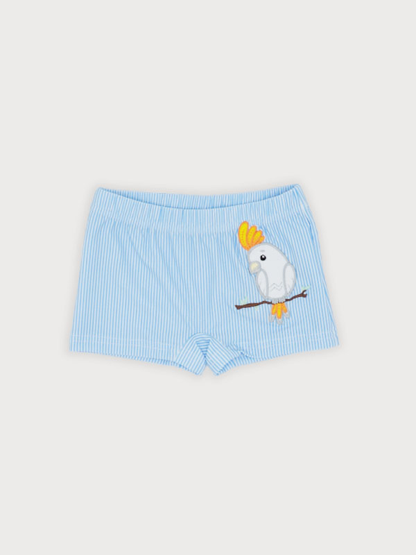 Conjunto de baño para bebé formado por camiseta y bóxer a juego. Bóxer con estampado de rayas en tonos azules y blancas con kakatua borada, la camiseta lleva una graciosa kakatua bordada a juego del bañador.