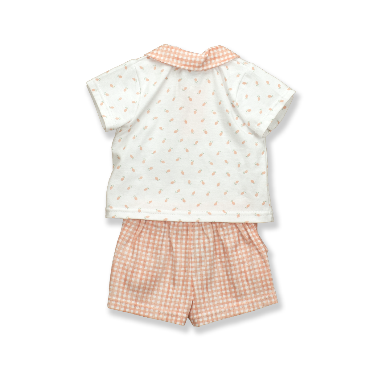 Precioso y fresquito conjunto de algodón de Babidu. Está confeccionado en tejido 100% Algodón en tonos naranja y compuesto por una camiseta de manga corta con tapeta y pantalón a juego.