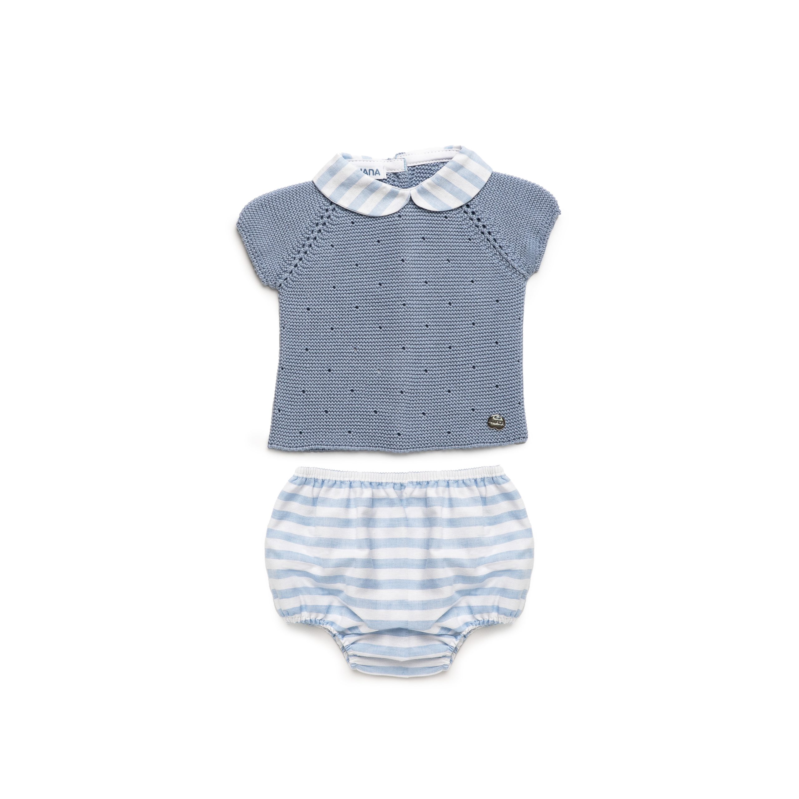 Conjunto de hilo para bebé formado por braguita de tejido 60% Algodón, 40% Lino con elegante estampado de rayas en tonos cielo y blanco con cuello bebé que lleva el mismo tejido que la braguita, está especialmente indicado para la época primavera/verano. Muy suave y agradable. Conjunto de Juliana Baby clothes.