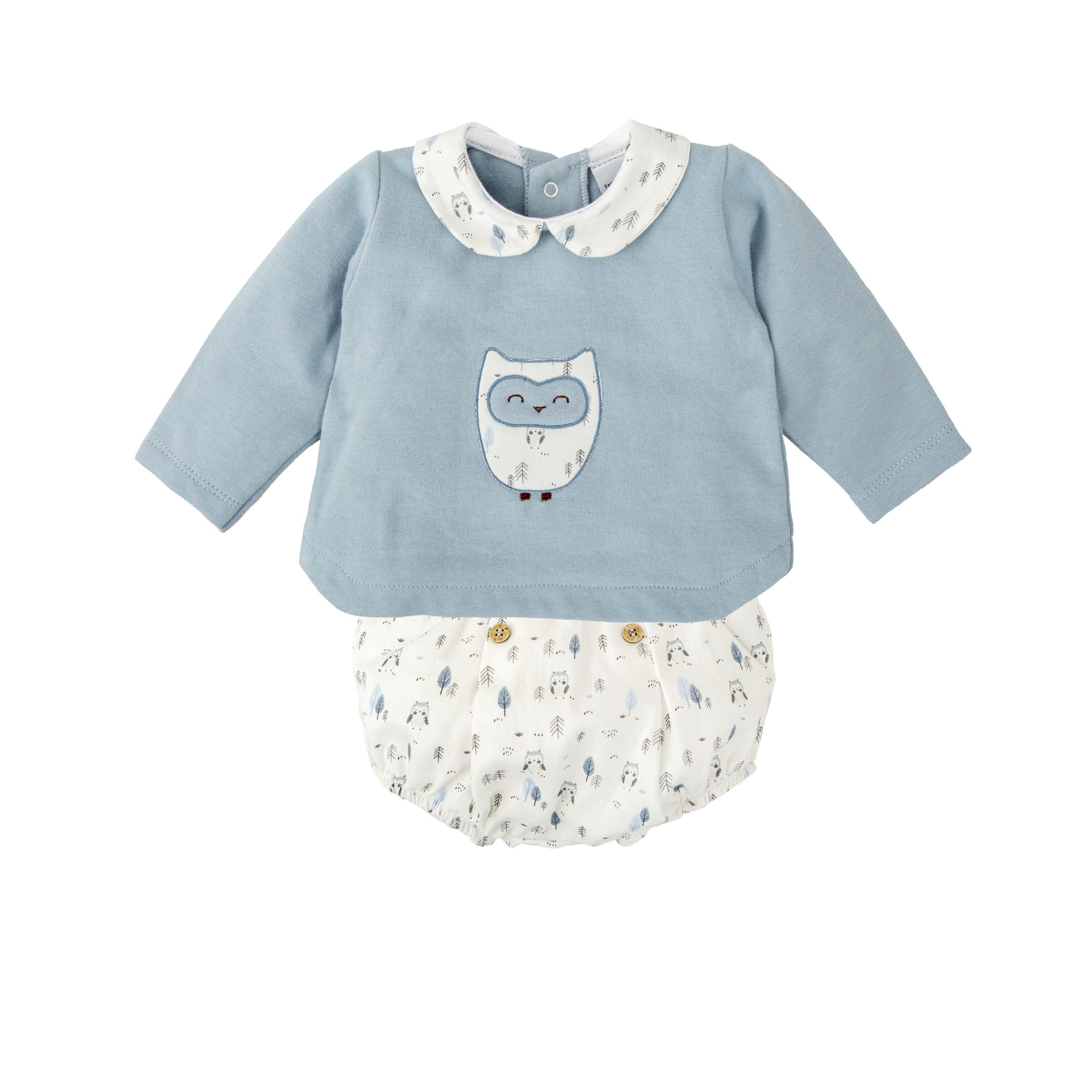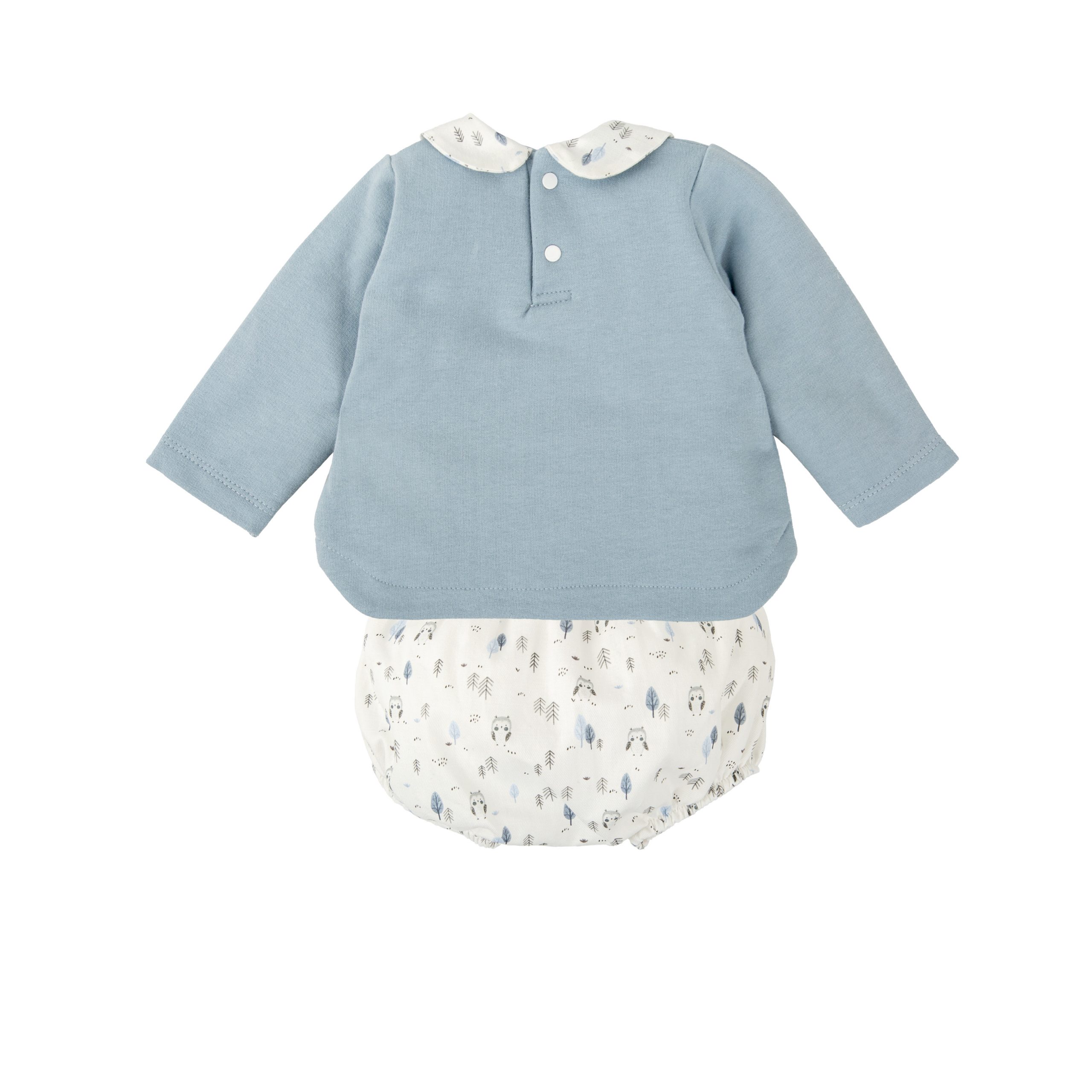 Este encantador conjunto para bebé combina dulzura y comodidad en partes iguales. La parte superior afelpada en azul celeste incluye un bordado de búho con carita simpática, mientras que el cuello Peter Pan y el pololo hacen juego con un alegre estampado de árboles y búhos en tonos azules y grises. Ideal para salidas otoñales o como conjunto especial para regalar.