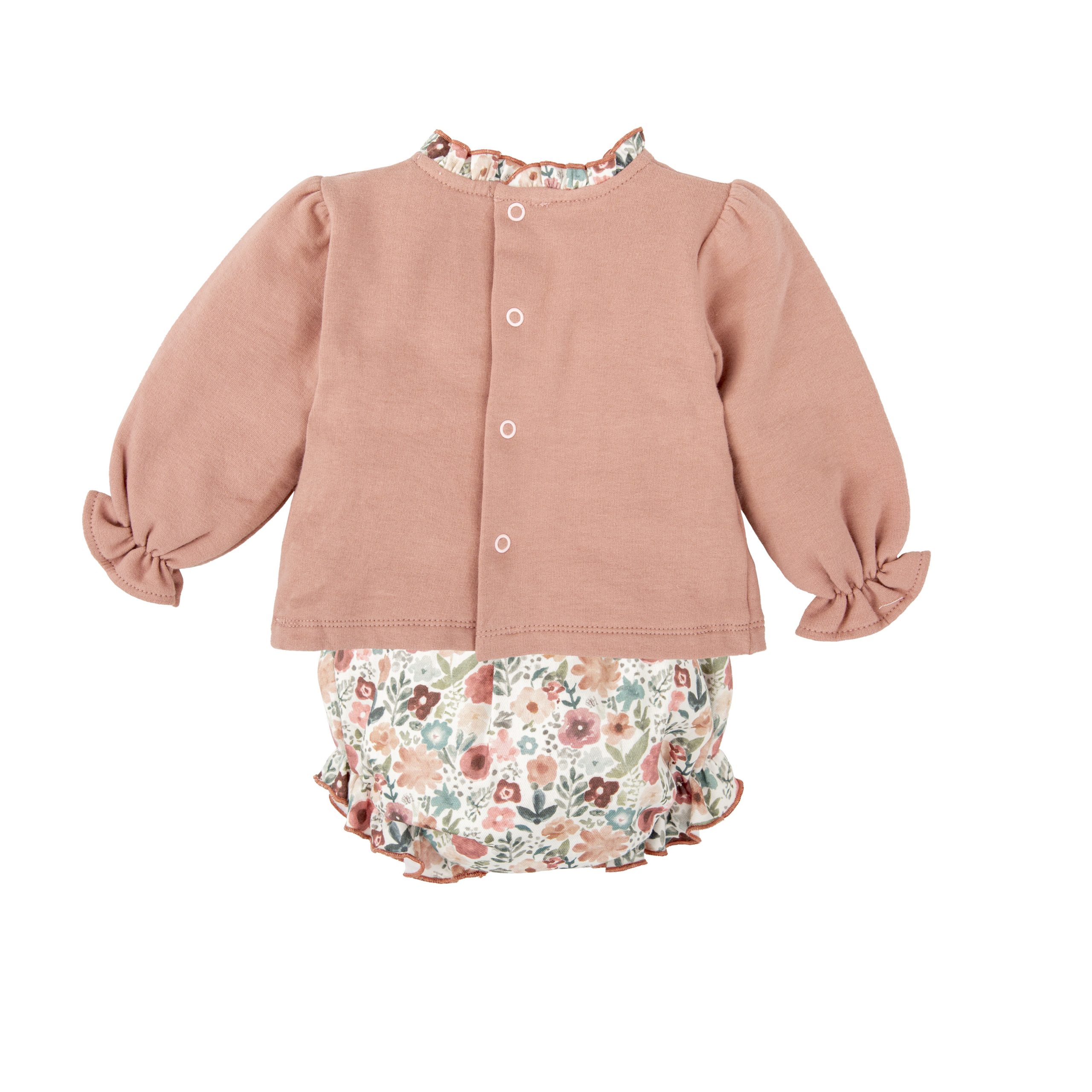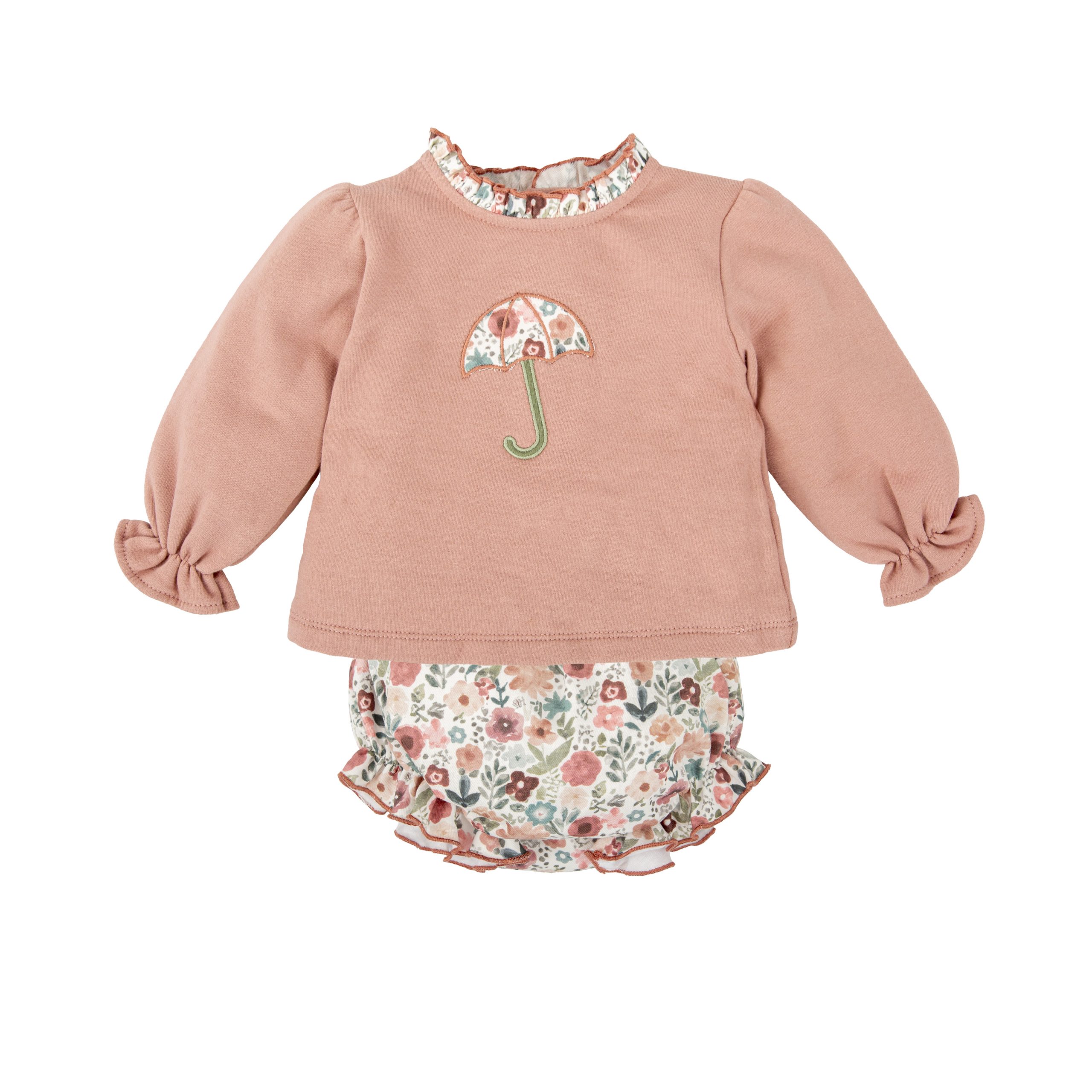 Un conjunto para bebé dulce y encantador, perfecto para las pequeñas que llenan de color incluso los días más grises. La camiseta afelpada en tono maquillaje destaca por el bordado de un paraguas con tejido floral, que combina con el cuello fruncido y el cubrepañal a juego. Las mangas con lacito fruncido añaden un toque coqueto y cómodo.