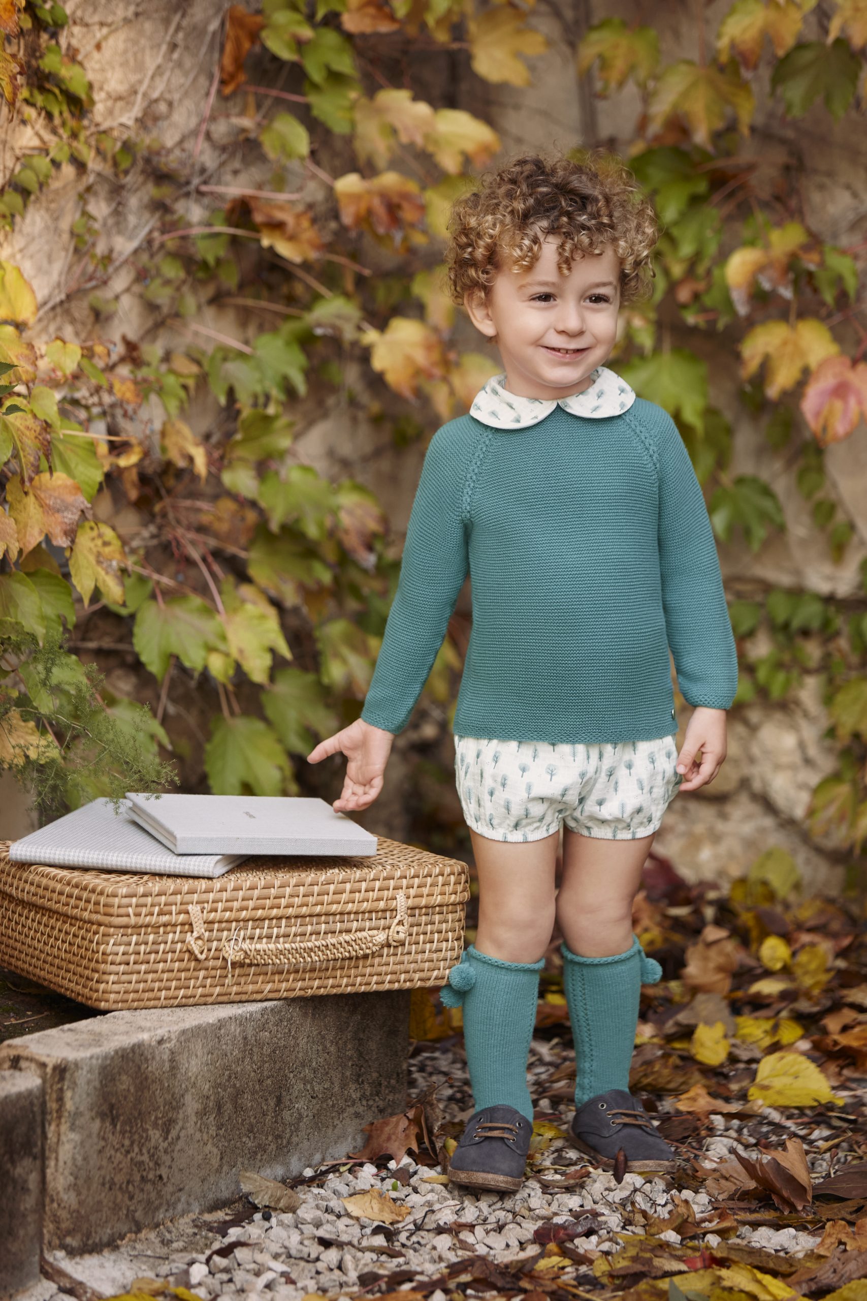 Conjunto de punto para bebé formado por Jersey con manga larga de punto en color Verde Báltico y pantalón a juego con estampado deárboles.