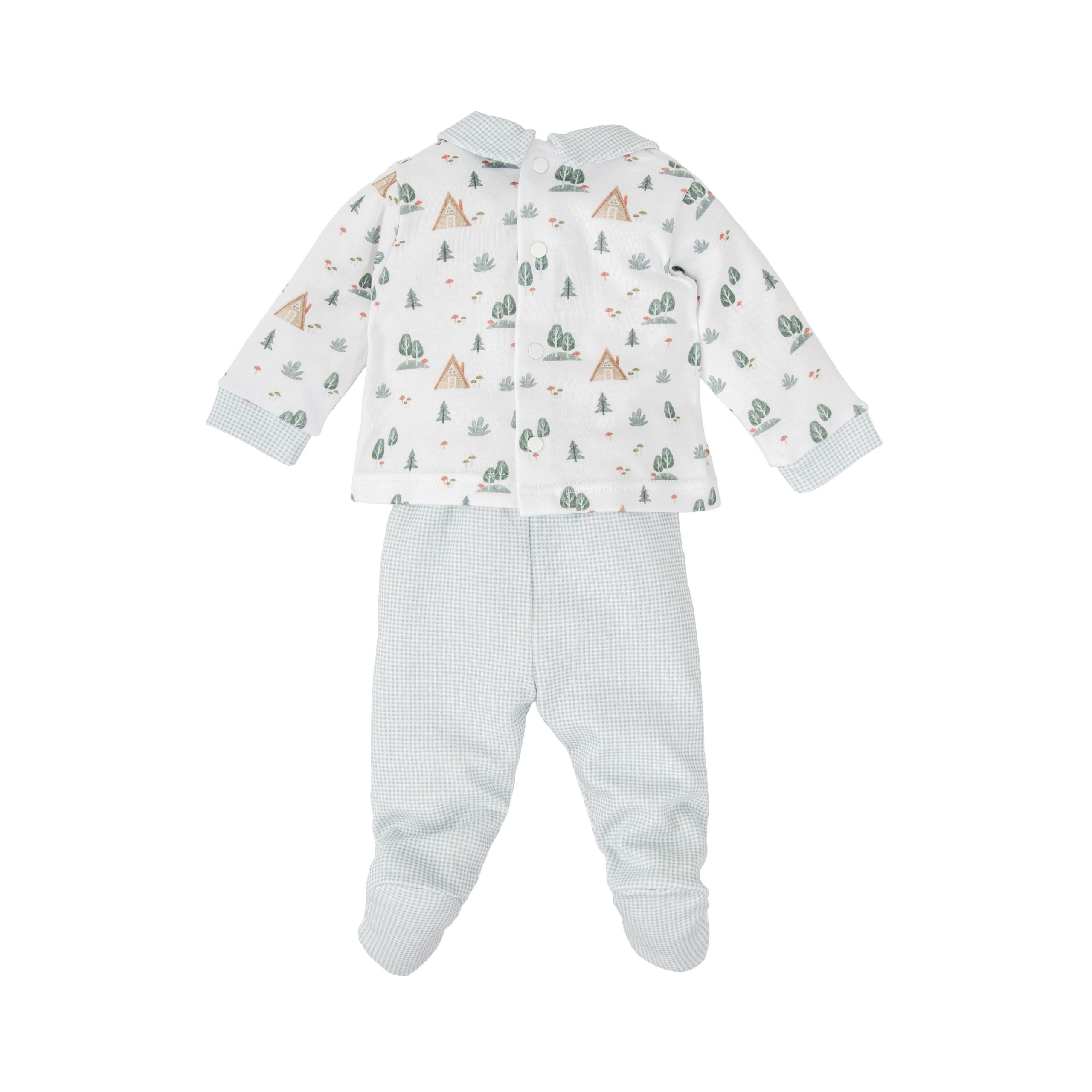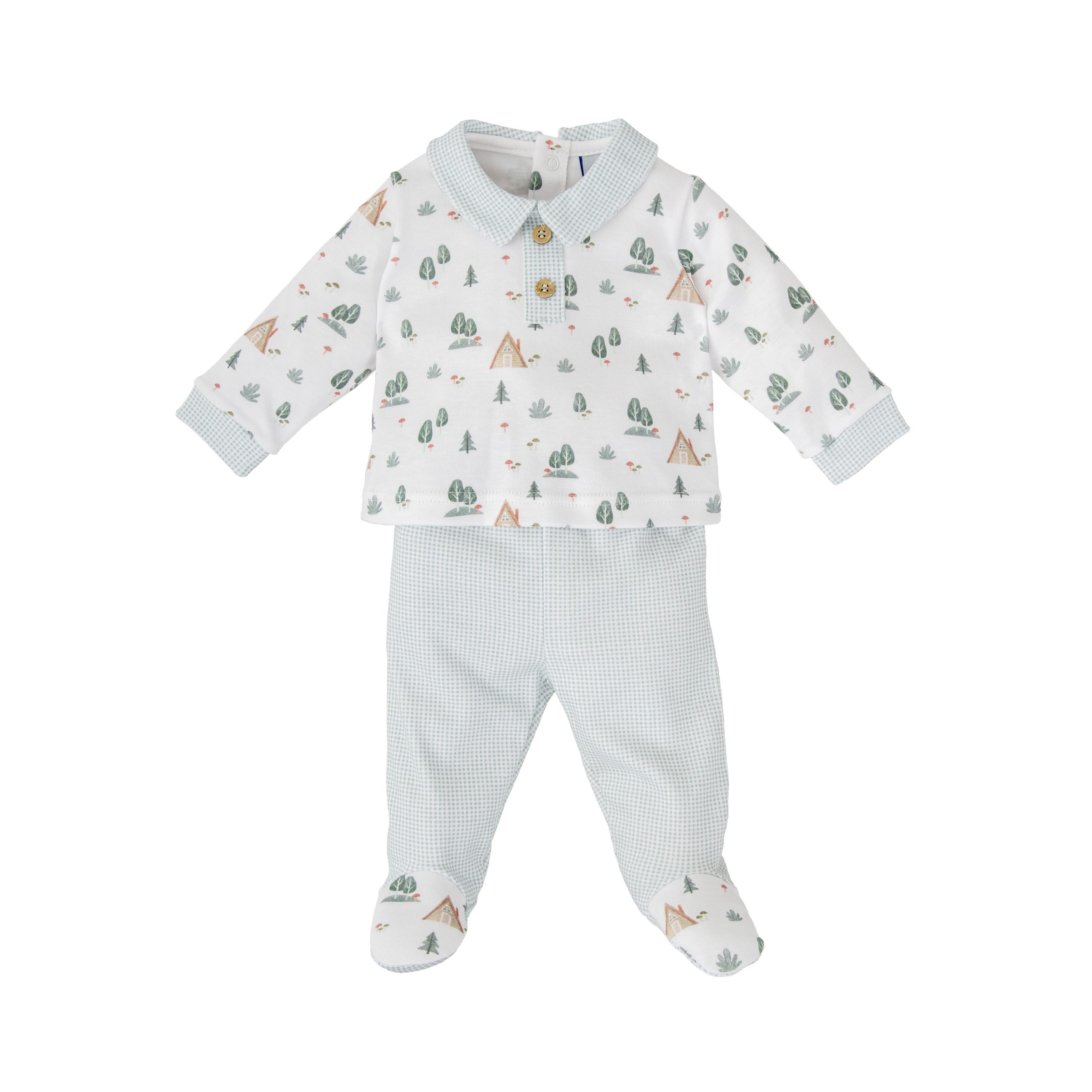 Precioso conjunto de 2 piezas de algodón de Babidu. Está formado por camiseta y polaina a juego confeccionado en tejido 100% Algodón con estampado de naturaleza. La camiseta lleva abertura trasera mediante broches de presión para que sea más fácil vestir al bebé.