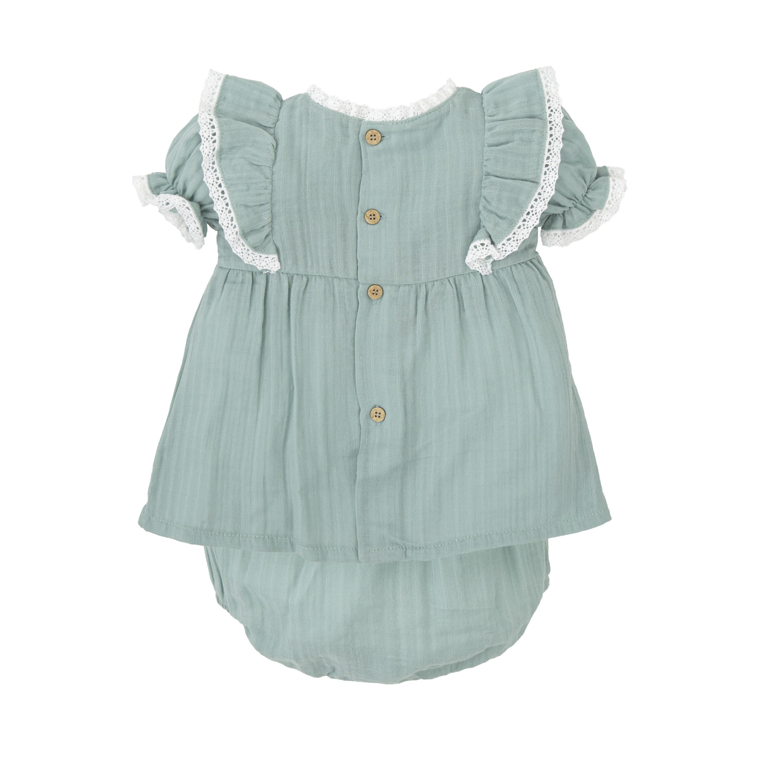 Precioso y fresquito jesusito de Babidu. Está confeccionado en tejido 100% Algodón en tono verde con detalles de puntilla blanca. El conjunto está formado por braguita en tono verde agua y jesusito a juego en el mismo tono.