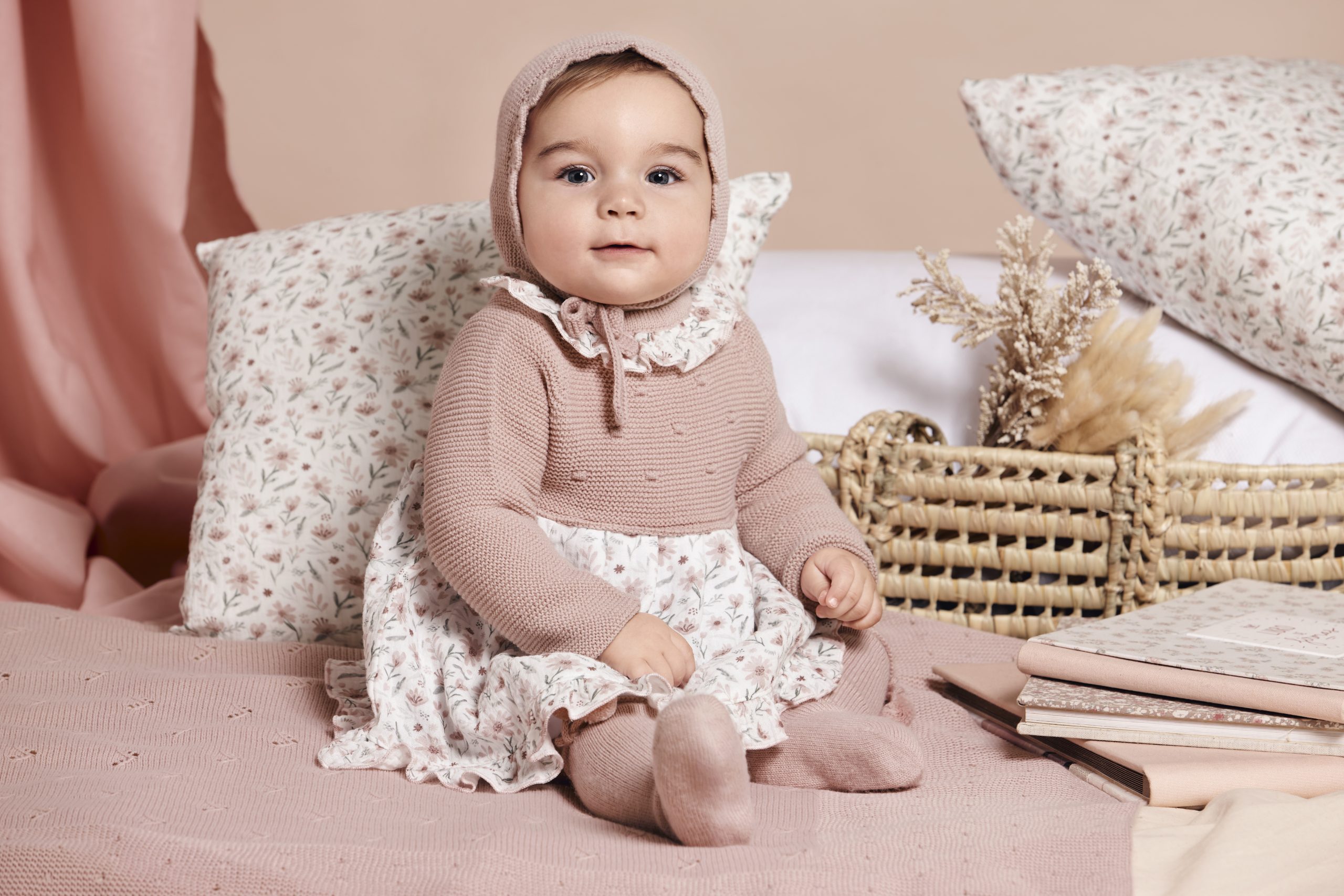 La parte del cuerpo es de punto en color rosa empolvado, manga larga y cuello volante. La falda estampada con tejido de florecitas a juego. Está abotonado en la espalda para mayor comodidad a la hora de su puesta. Muy suave y agradable. Incluye capota y braguita a juego.