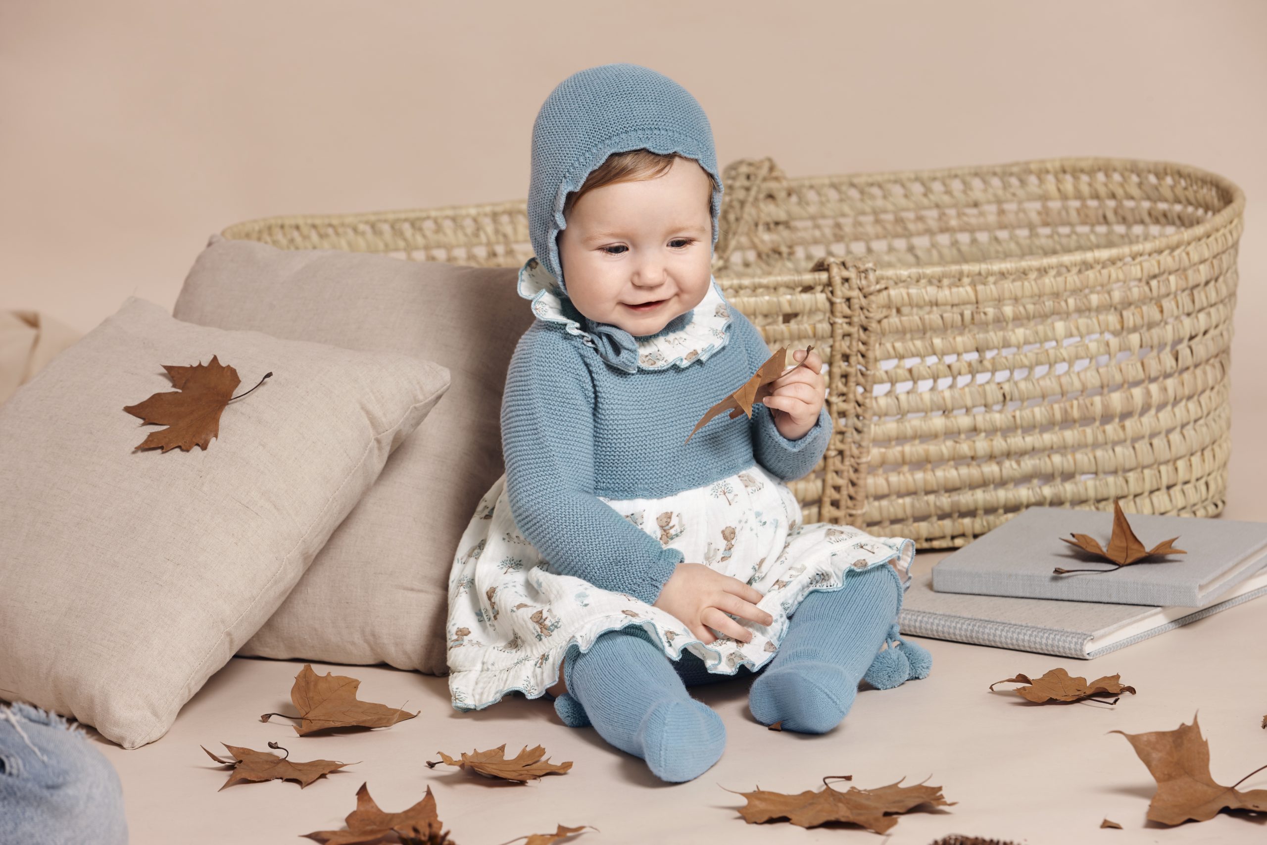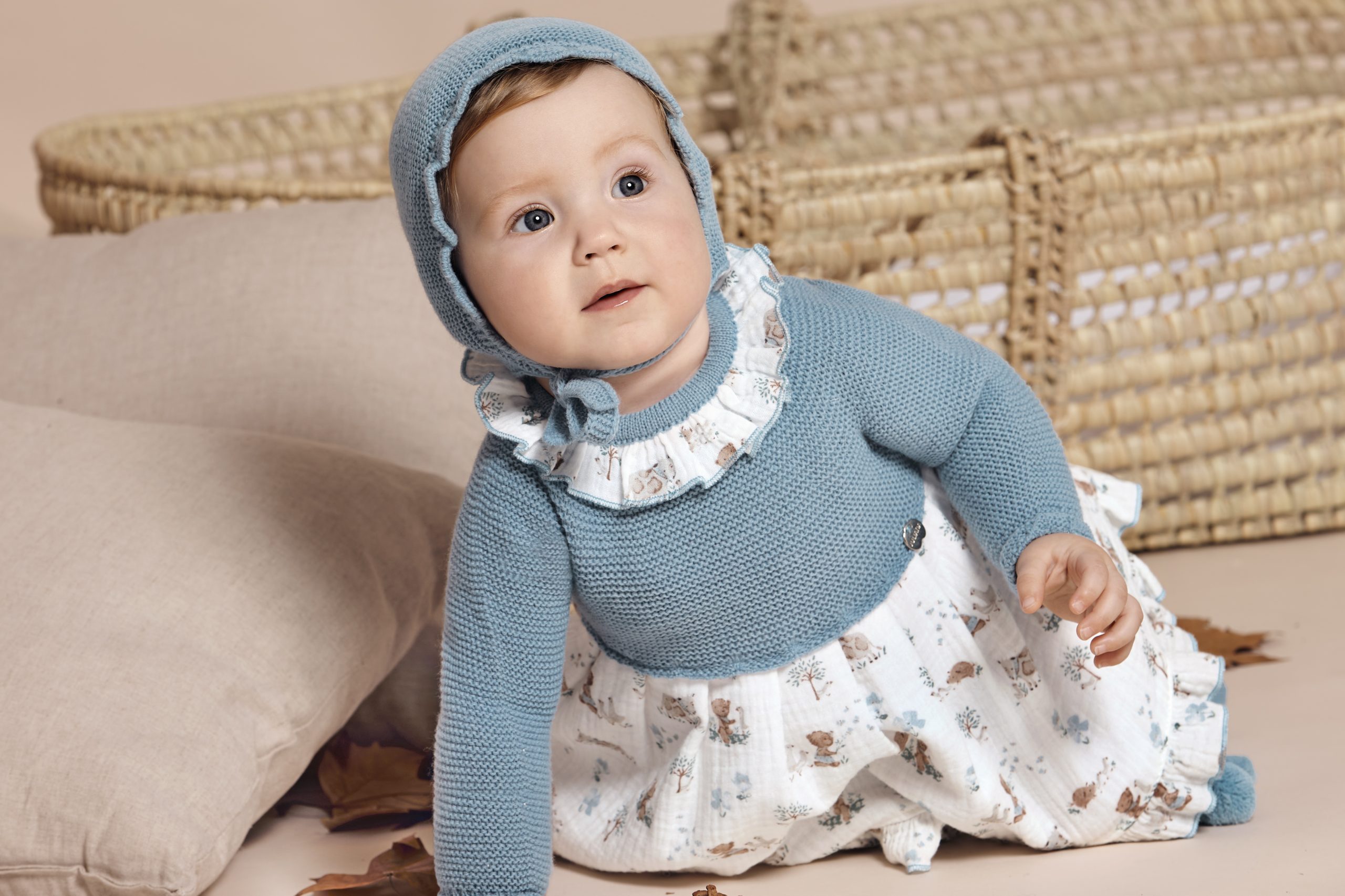La parte del cuerpo es de punto en color Azul Nube, manga larga y cuello volante. La falda estampada con tejido de graciosos animalitos a juego. Está abotonado en la espalda para mayor comodidad a la hora de su puesta. Muy suave y agradable. Incluye capota y braguita a juego.