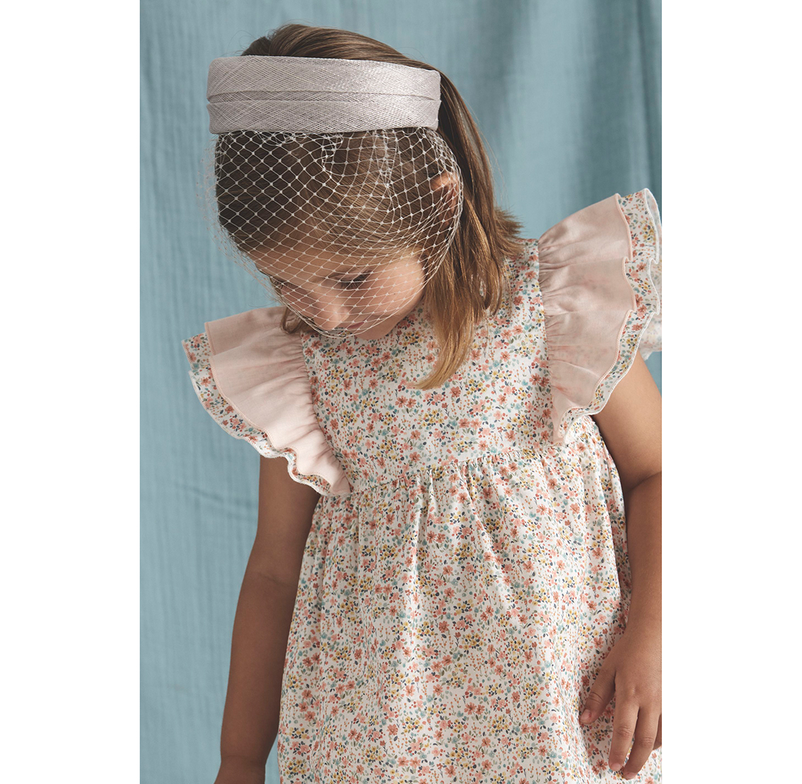 Precioso Jesusito Babidu. Está confeccionado en tejido 100% Algodón con estampado de pequeñas flores en tonos naranja. Lleva manga sisa adornadas con volante y braguita a juego.