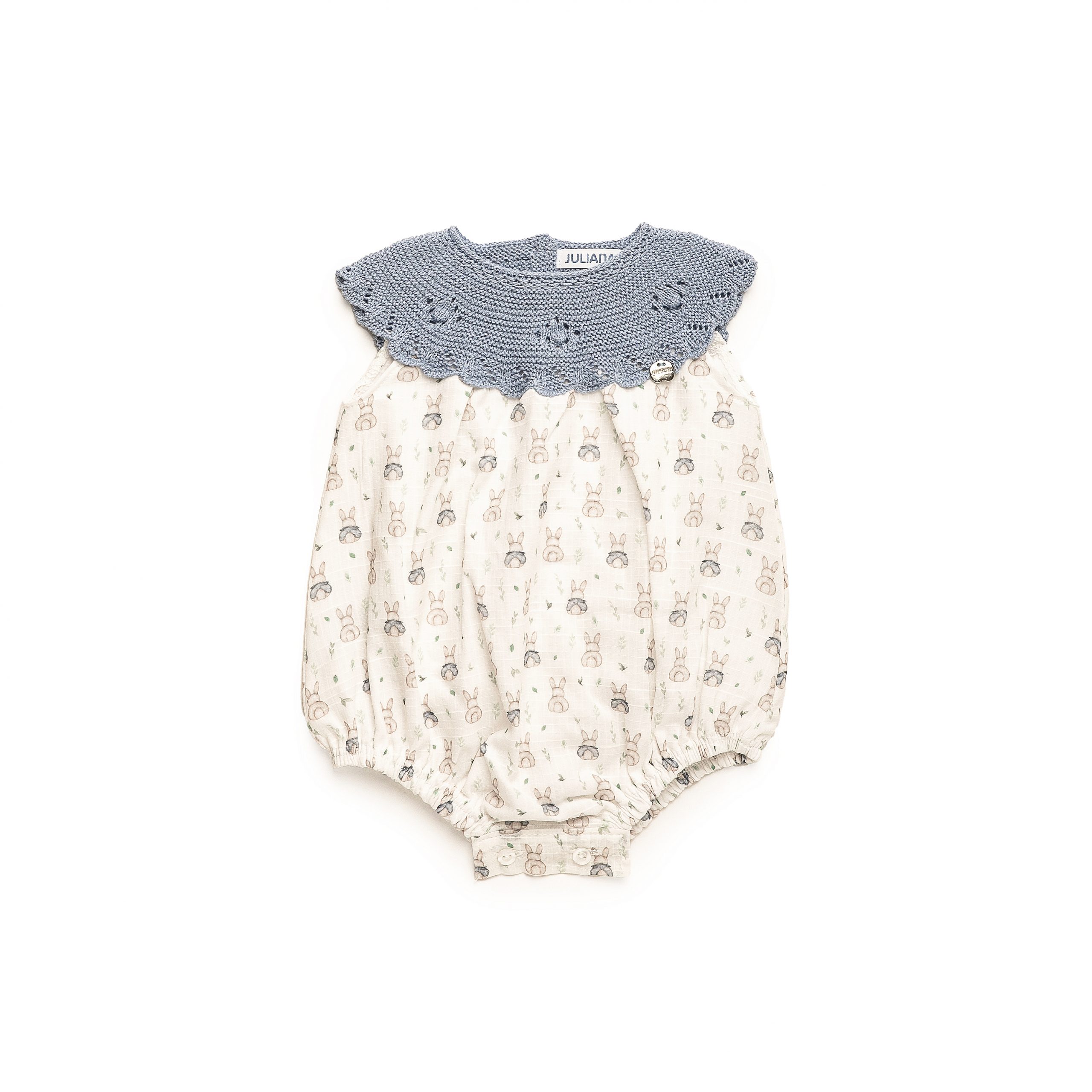 Sencillo, pero precioso Pelele confeccionado en tejido 100% Algodón con estampado graciosos conejos. Lleva el cuerpo de punto en color azul cielo a juego. Pelele de Juliana Baby clothes.