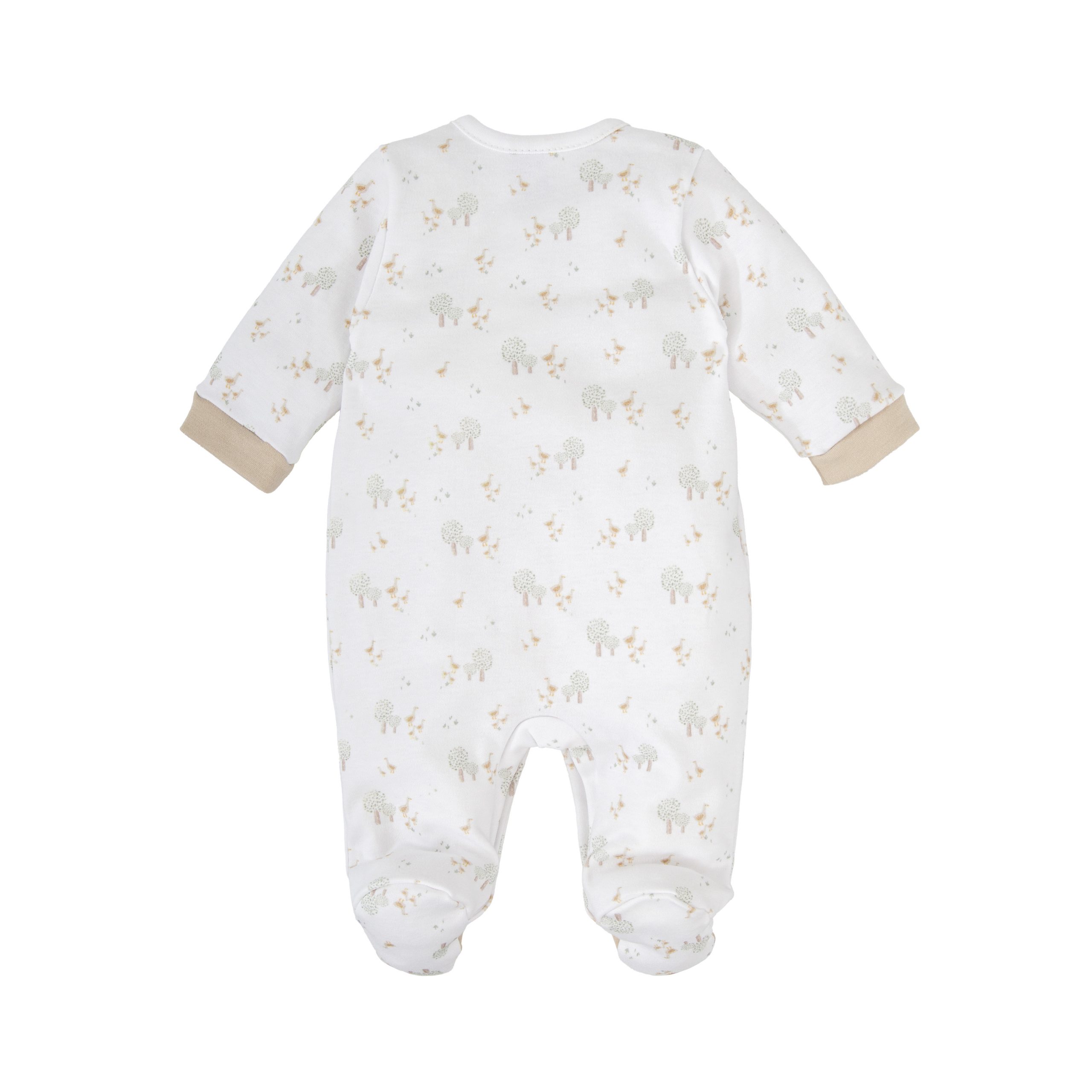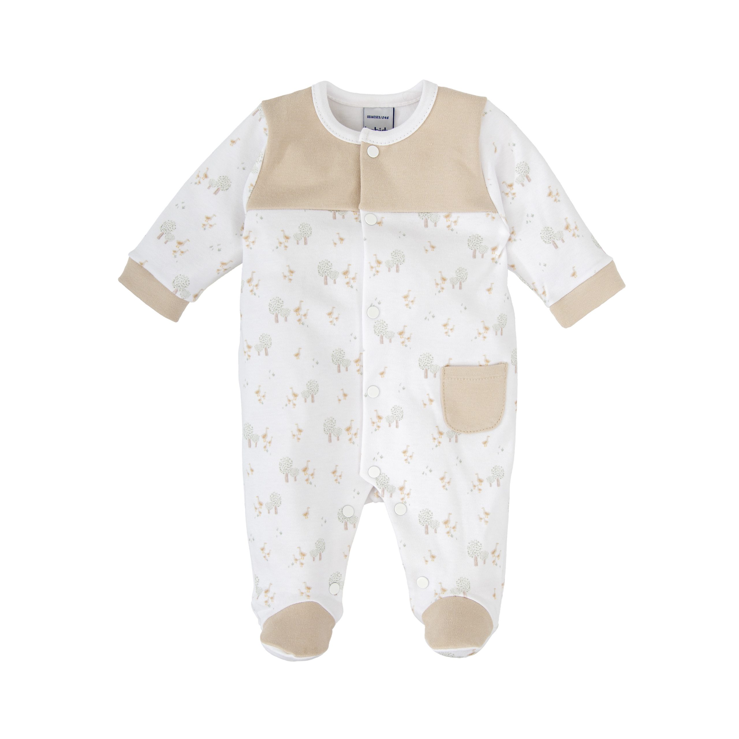 Precioso pelele de algodón de Babidu. Está confeccionado en tejido 100% Algodón con estampado de patitos y árboles. El pelele lleva el cuello redondo y abertura delantera mediante botones de presión.