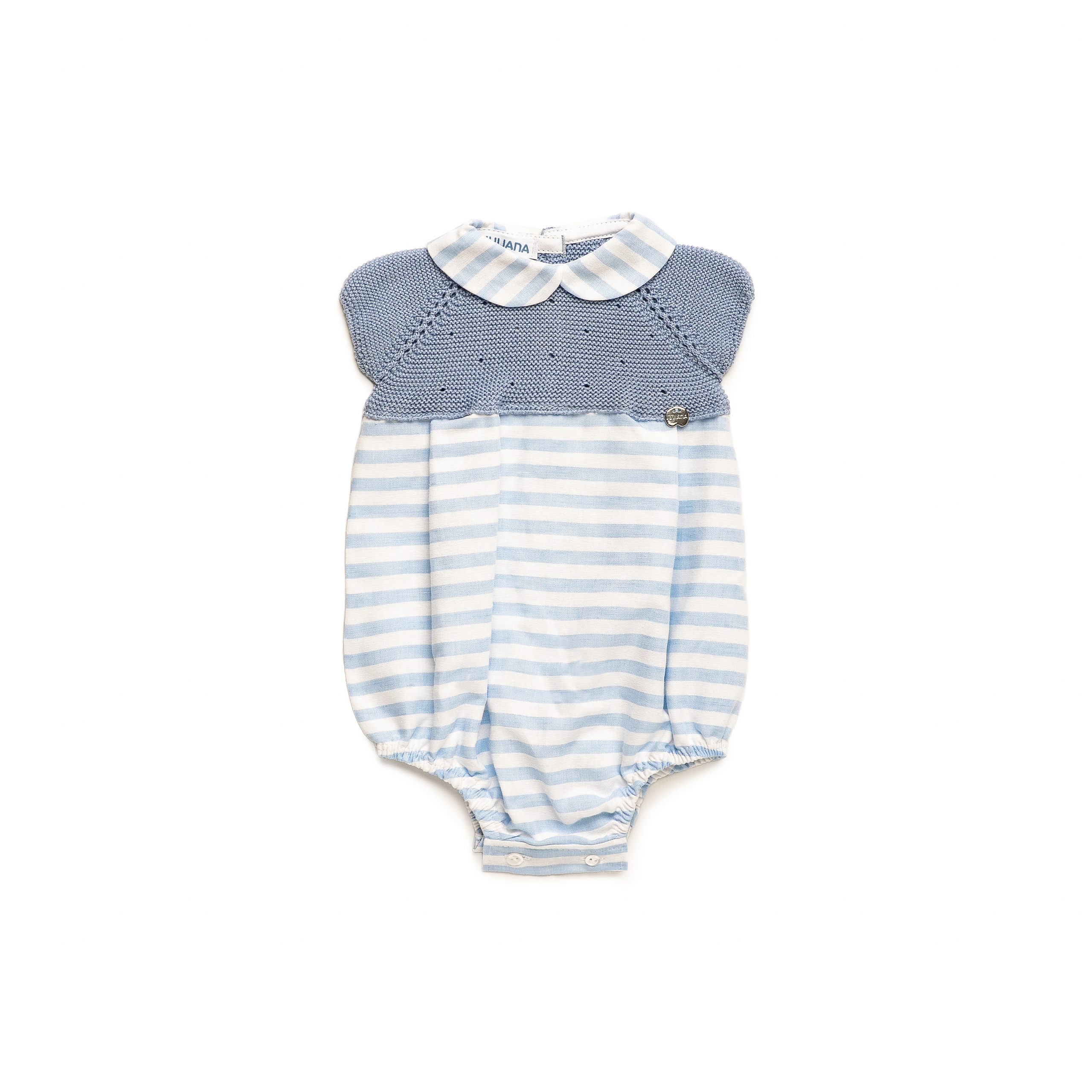 Sencillo, pero precioso Pelele confeccionado en tejido 60% Algodón, 40% Lino con estampado de rayas blancas y azules. Lleva el cuerpo de punto en color azul cielo con el cuello bebé a juego. Pelele de Juliana Baby clothes.