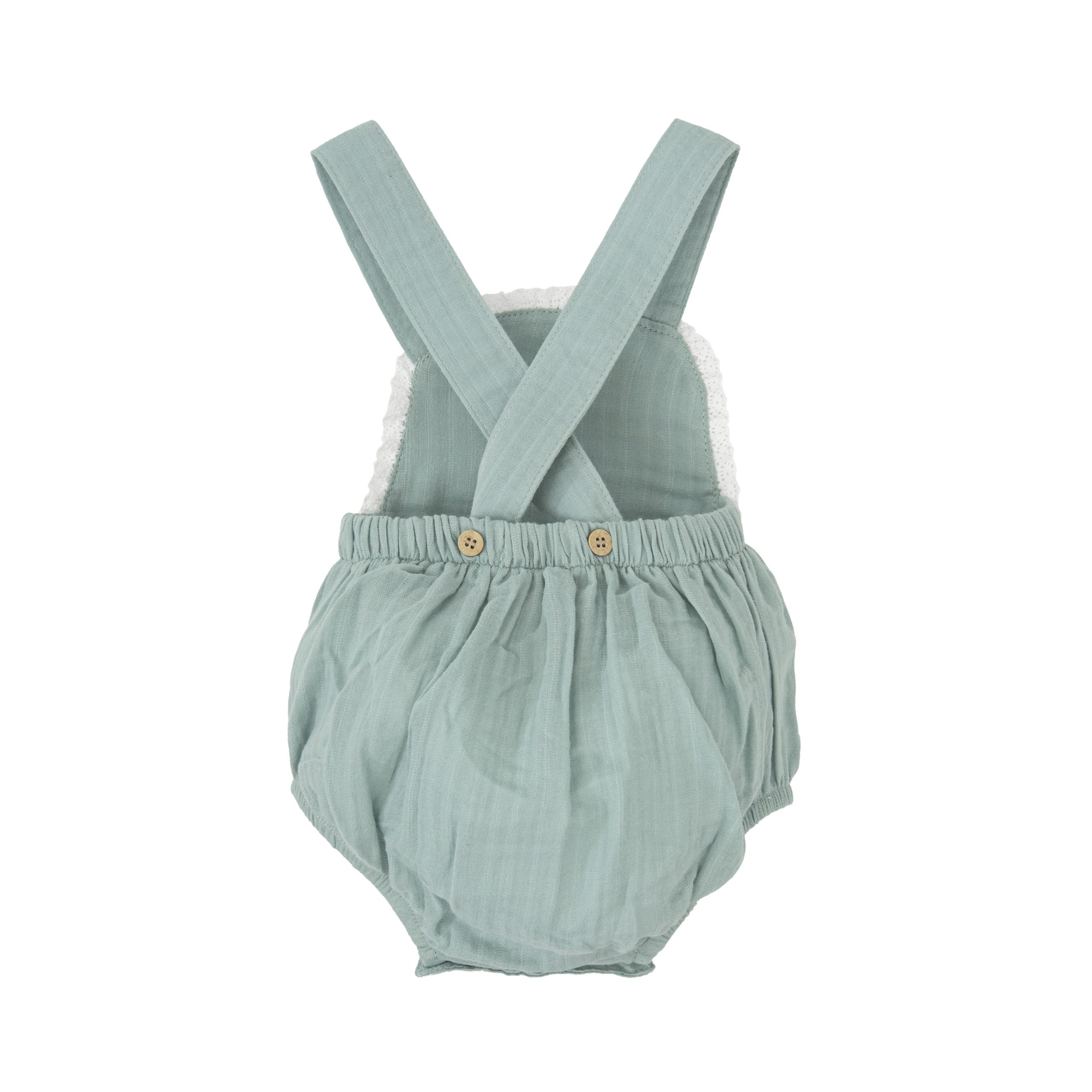 Precioso y fresquito peto para bebé de Babidu. Está confeccionado en tejido 100% Algodón en tono verde con detalles de puntilla blanca.