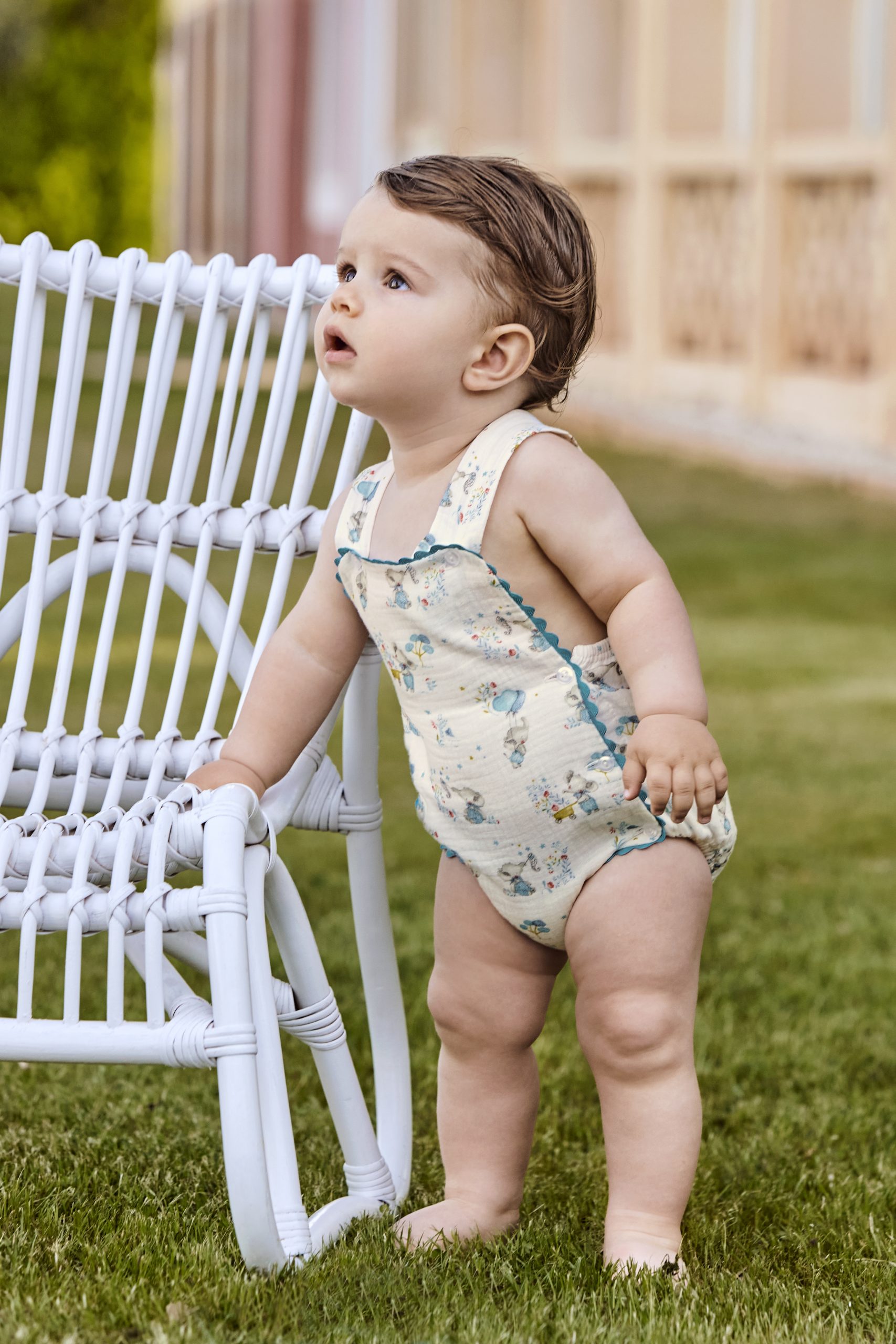 Precioso y fresquito peto para bebé de Juliana. Está confeccionado en tejido 100% Algodón  con un gracioso estampado de elefantes. Lleva detalles a juego en azul turquesa