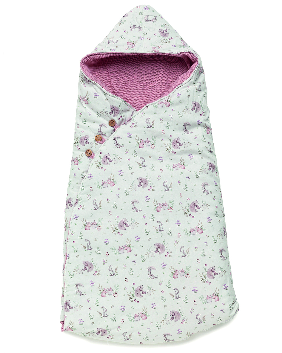 Práctico saco para bebé recién nacido, confeccionado en tejido con gracioso estampado de animalitos e interior forrado de punto de tricot en color rosa empolvado a juego.