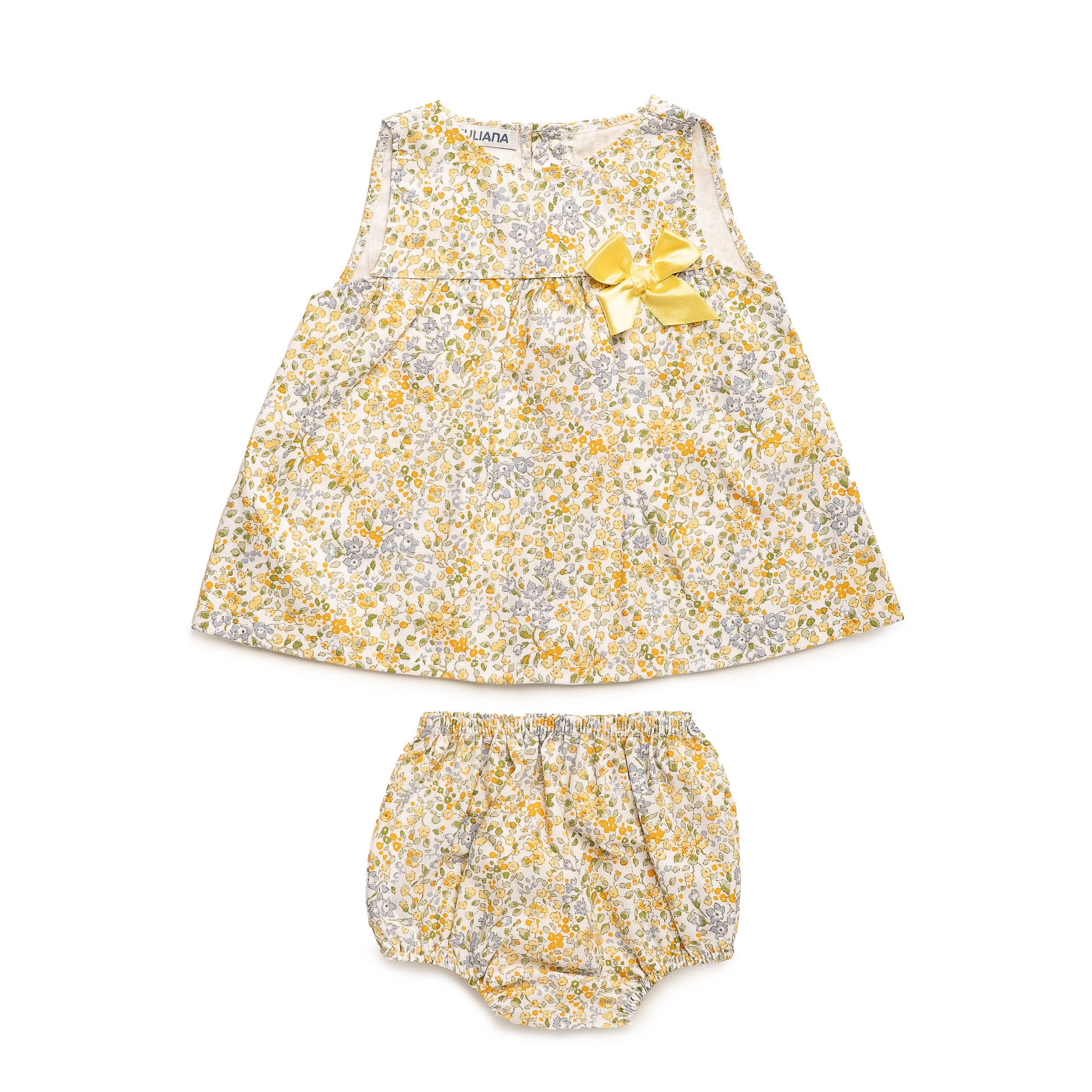 Precioso elegante Vestido corto con braguita confeccionado en tejido 100% Algodón con estampado de florecitas en tonos amarillos y azules. Lleva braguita a juego del mismo tejido. Vestido de Juliana Baby clothes.
