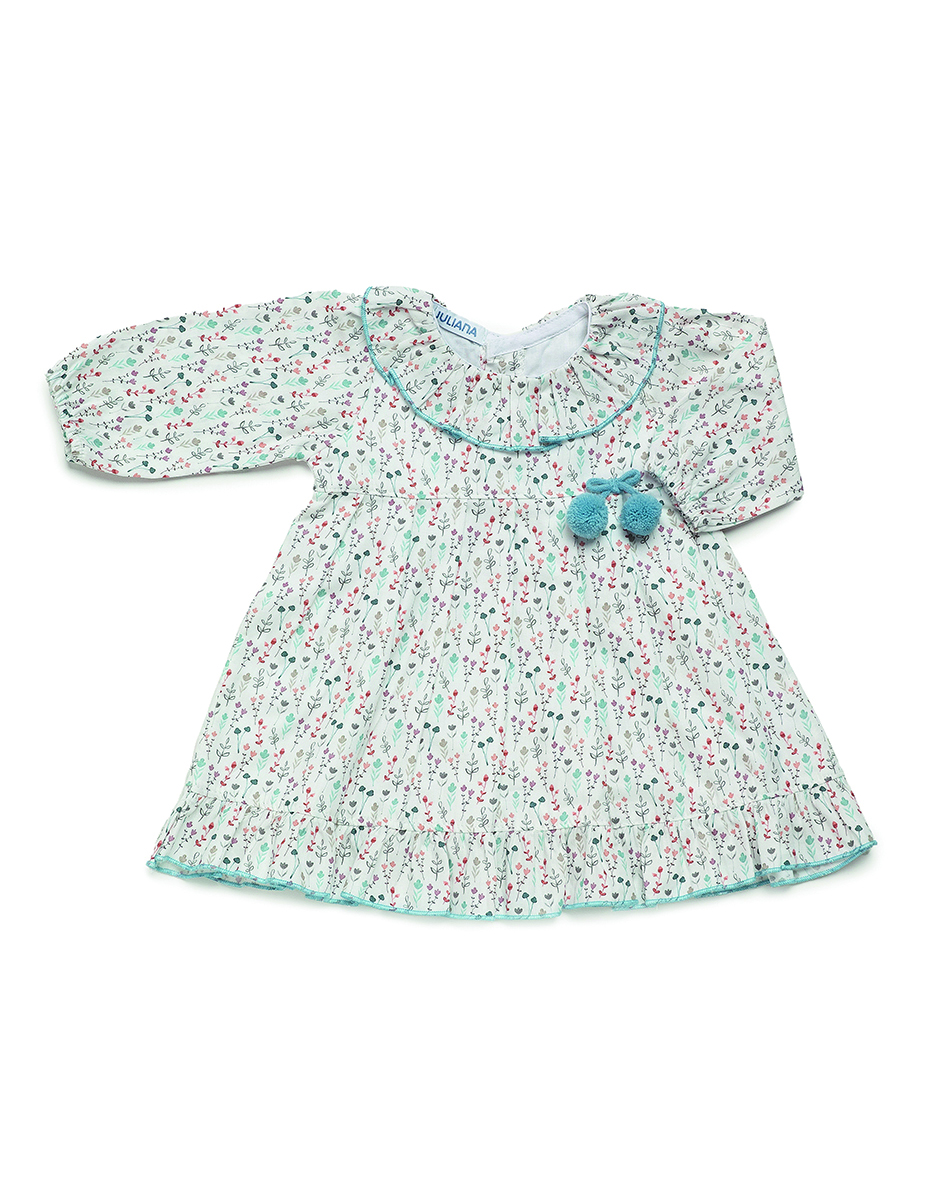 Precioso y elegante Vestido niña confeccionado en tejido 100% algodón de preciosas ramitas en tonos nube. Va adornado con un cuello volante y un pompón en la parte delantera a juego.