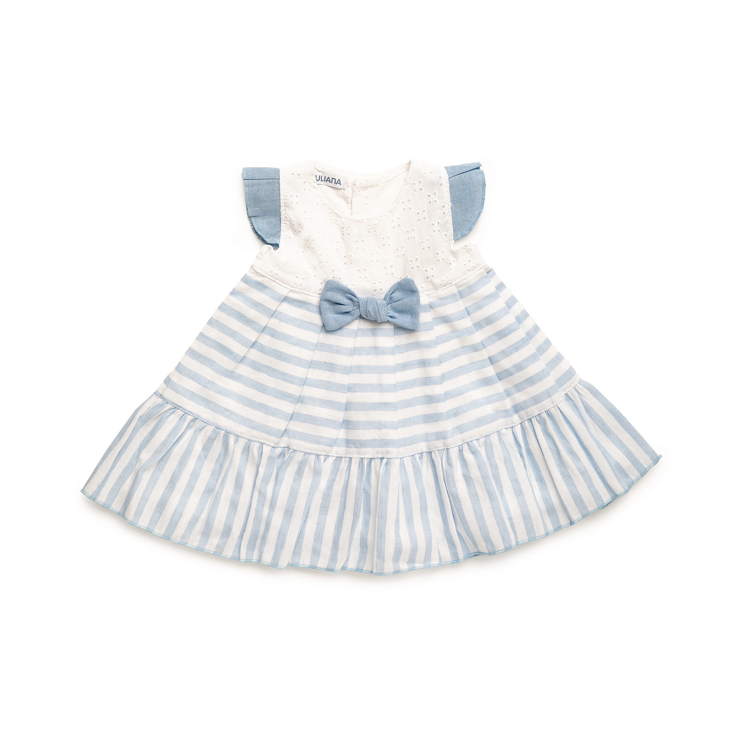 Precioso y elegante Vestido confeccionado en tejido 60% Algodón,40% Lino. El cuerpo es de batista bordada perforada blanca y la falda lleva rayas blancas y azul celeste, lleva detalles en azul celeste a juego. Vestido de Juliana Baby clothes.