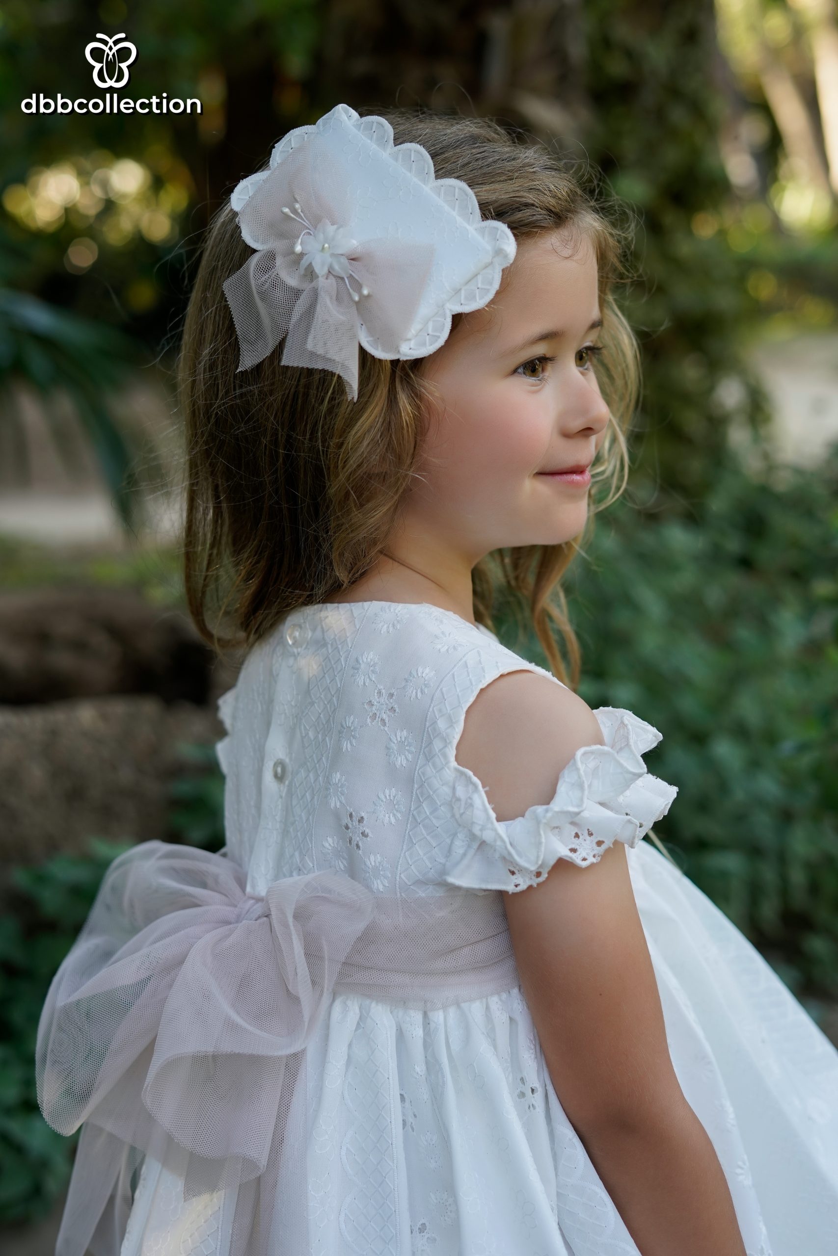 Precioso y elegante vestido realizado en tejido crudo bordado adornado con cinturón de tul de color camel que termina con un gran lazo en la espalda.