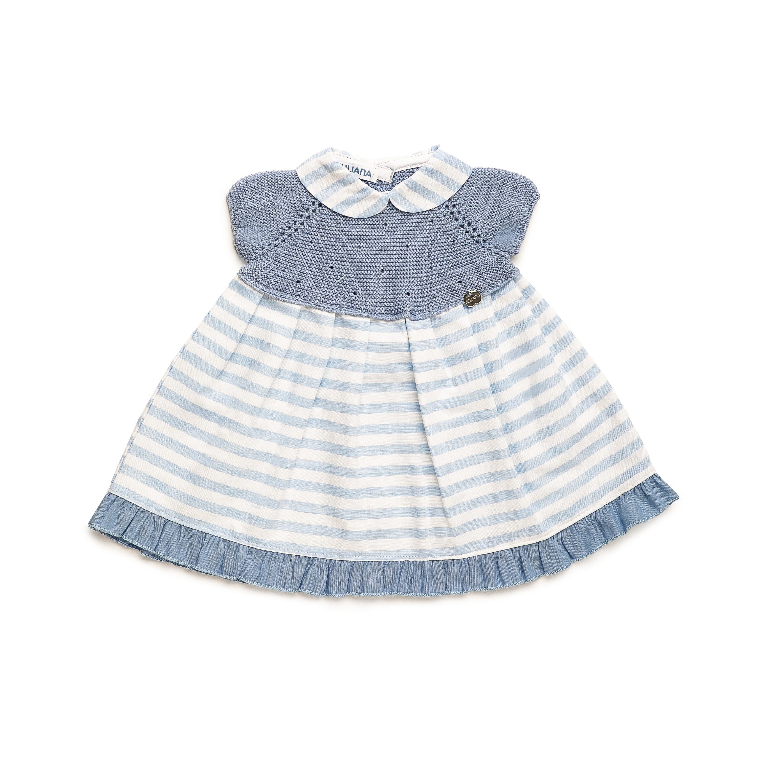 Sencillo, pero elegante Vestido confeccionado en tejido 60% Algodón y 40% Lino con estampado de rayas blancas y celestes. Lleva el cuerpo de punto en color cielo con cuello bebé a juego. Vestido de Juliana Baby clothes.