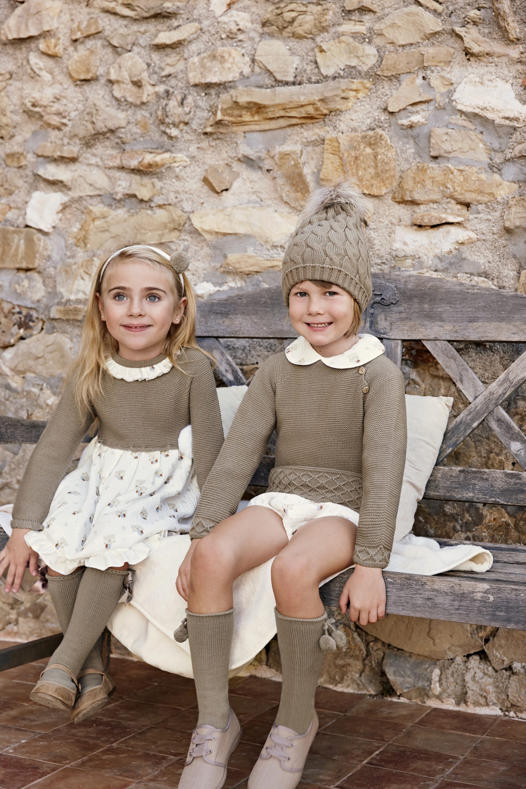La parte del cuerpo es de punto en color Tostado, manga larga y cuello volante. La falda estampada con tejido de gracisoso búhos a juego. Está abotonado en la espalda para mayor comodidad a la hora de su puesta. Lleva un pompón de pelo blanco a juego en la parte delantera. Muy suave y agradable. Incluye capota.