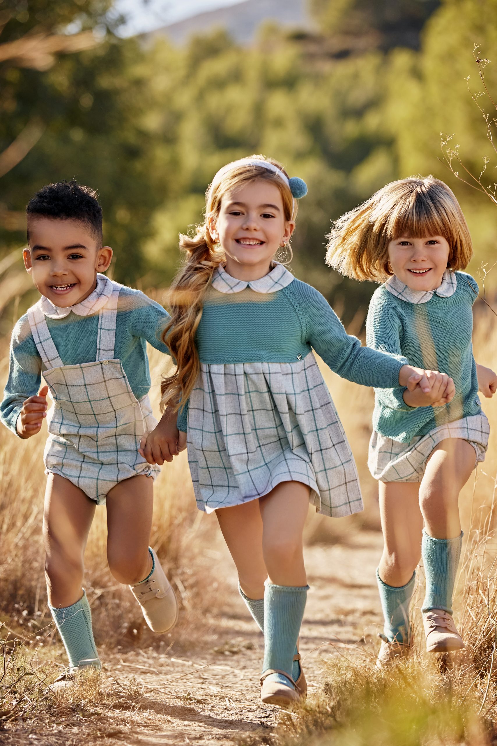 La parte del cuerpo es de punto en color Verde Báltico, manga larga y cuello bebé a juego. La falda estampada con tejido de cuadros grises y verdes a juego. Está abotonado en la espalda para mayor comodidad a la hora de su puesta. Muy suave y agradable.